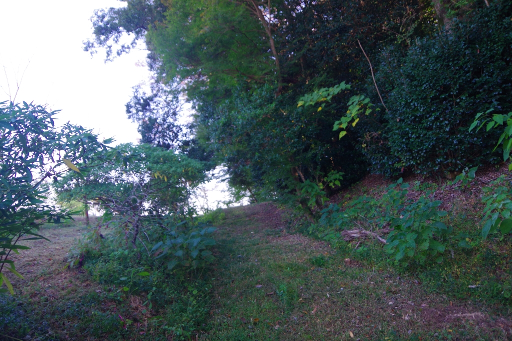 周囲を土塁で囲まれ一ヶ所出入口として使われていたであろう切通・・虎口?が設けられています。その中心には「阿保頓宮跡」を示す石碑が据えられているのですが、とりあえず全景を感じてもらえればと思い、土塁の上から撮影した写真を載せたのですが、現地でも感じたのですがなんか・・・・城館時代に築かれた土塁だとしたらなんか狭くないかって思いませんか?。頓宮の時代は土塁は築かれず、あっても木などで造られた柵程度だった思うので狭さは感じなかったかと思いますが、土塁で視界を遮られると視覚的に圧迫感を感じてしまいます。