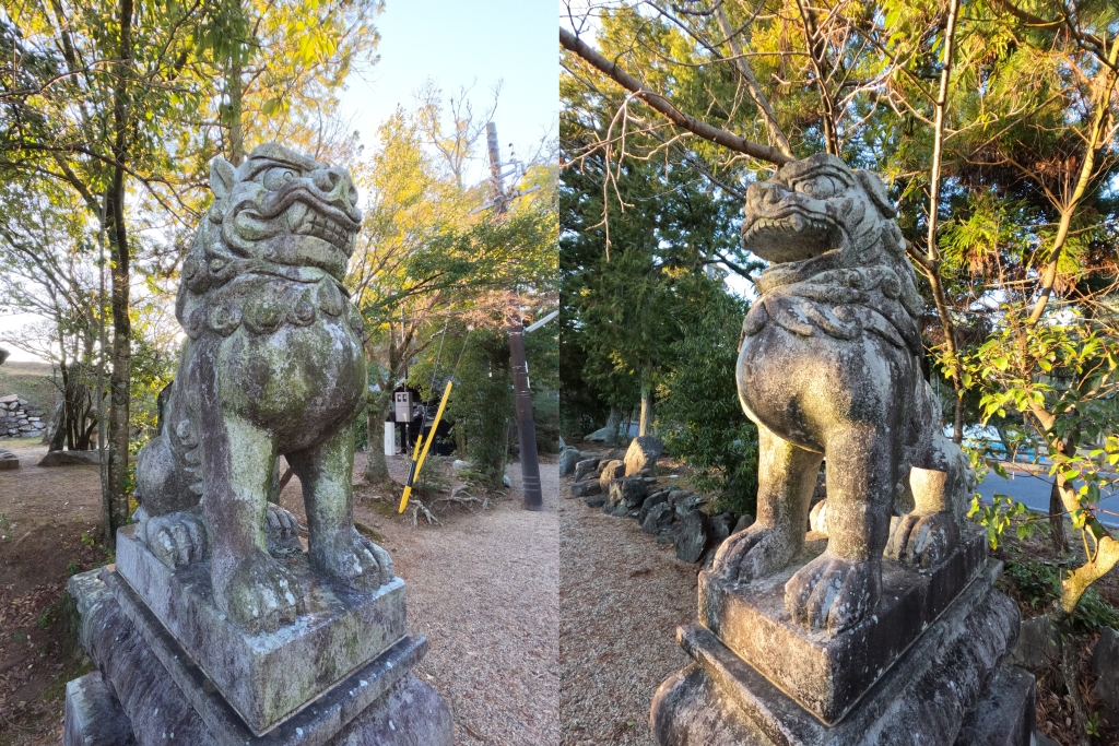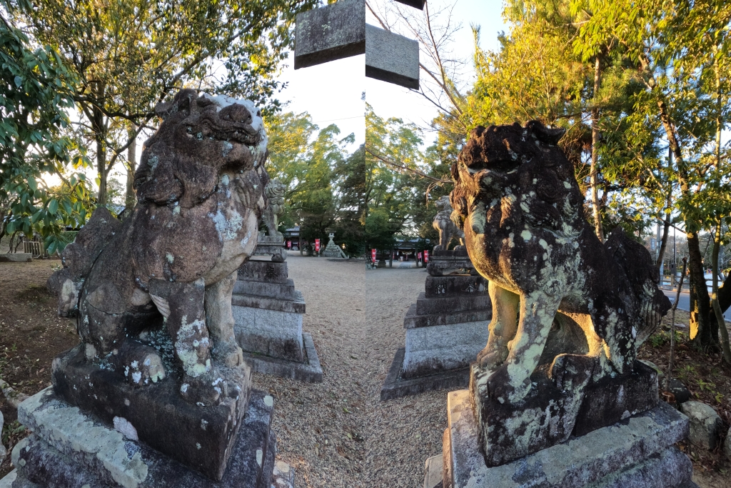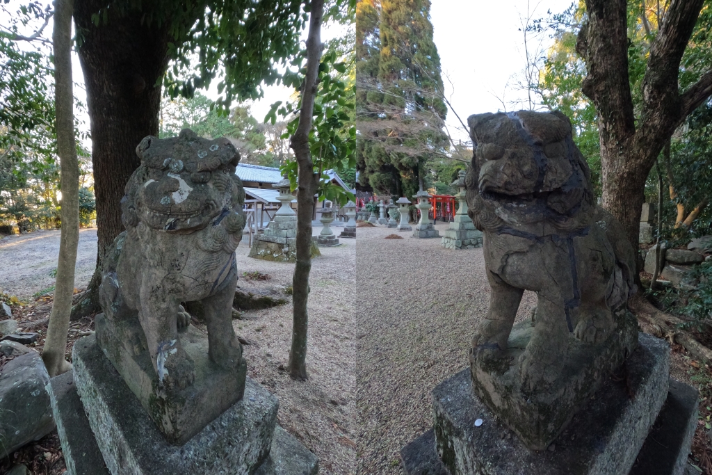 境内には三対の狛犬が鎮座しています。自分の故郷の岡崎市でもたまに見かけたんですが御影石とは異なって表面がはがれる感じの風化が進んでしまっているのが残念なんですが、3番目の狛犬は岡崎型でも浪花型でもない京都系らしいのですが、自分にはその違いがよくわかりません・・・。