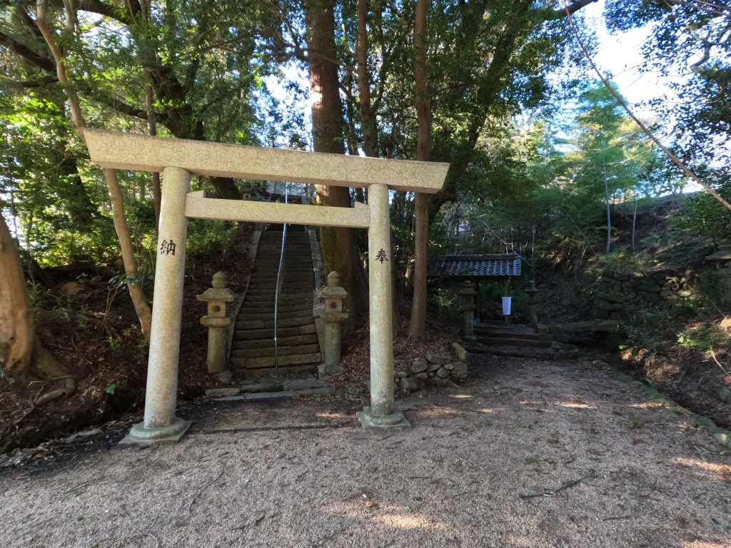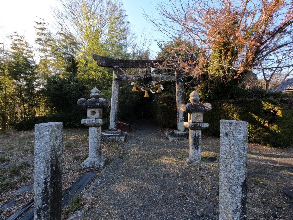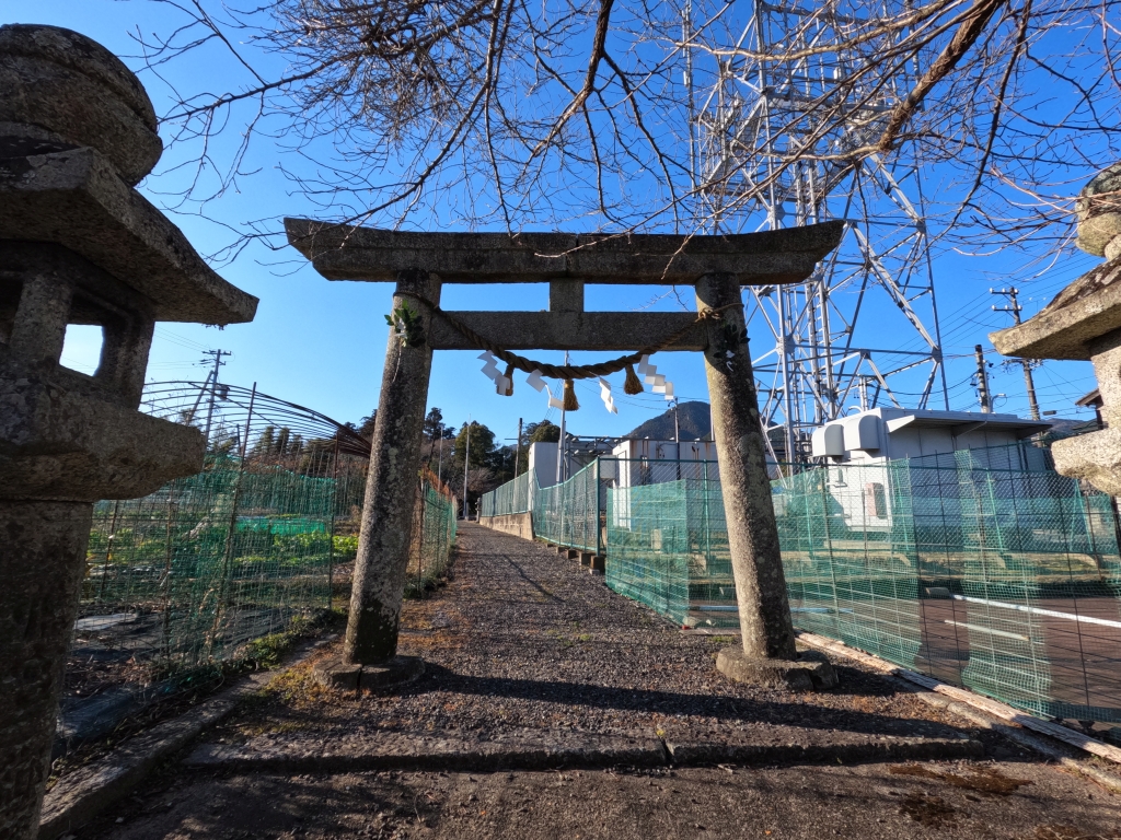 明神鳥居による一の鳥居になります。ここからNTTの基地局と畑の間を参道が境内に向けて伸びています。