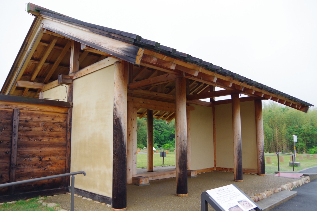 八脚門の正門になります。非常に簡素な造りの再現になっているのですが、神社仏閣などでみかける八脚門と基本的な構造は変わっていない事がわかるかと思います。大きな違いといえば、この時期の建物は掘立柱建物だという点でしょうか。そういえば、この遺跡内では竪穴式住居跡も見つかっているそうですが掘立柱建物が建てられた年代では竪穴式住居跡が見つかっていない事からまさに建造物のイノベーションの過程を見ることができる遺蹟という事みたいです。