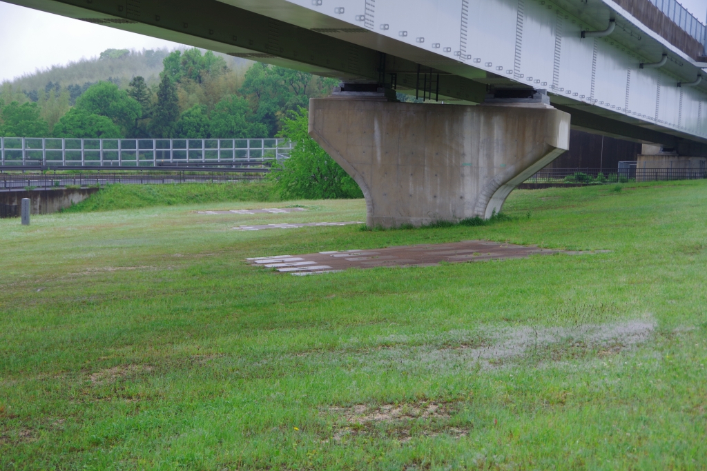 久留倍官衙遺跡の発掘調査は北勢バイパスの建設に際して行われた経緯があり、遺跡を縦断するように北勢バイパスの高架橋が走っています。そのおかげ?で高架上からも再現された建物など遺蹟を確認する事が可能になっています。バイパス本道を走っている場合、遺蹟前後のランプから下道に入ってそのまま進んでいくと遺蹟駐車場にたどり着くことができます。